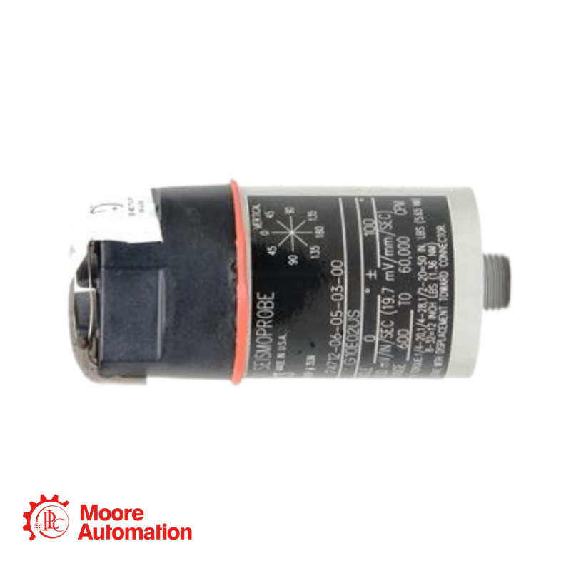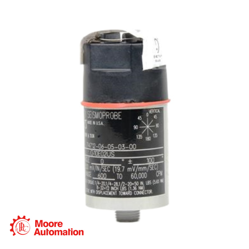 The Bently Nevada 74712-06-02-03-00 is a high-temperature, two-wire moving-coil velocity transducer from the Seismoprobe family, specifically engineered for absolute casing and structural vibration measurements in extreme thermal environments up to +204°C (+400°F). Unlike solid-state accelerometer-based sensors, the moving-coil design inherently rejects high-frequency impulsive excitation, delivering a clean voltage signal directly proportional to vibration velocity without requiring external power. |