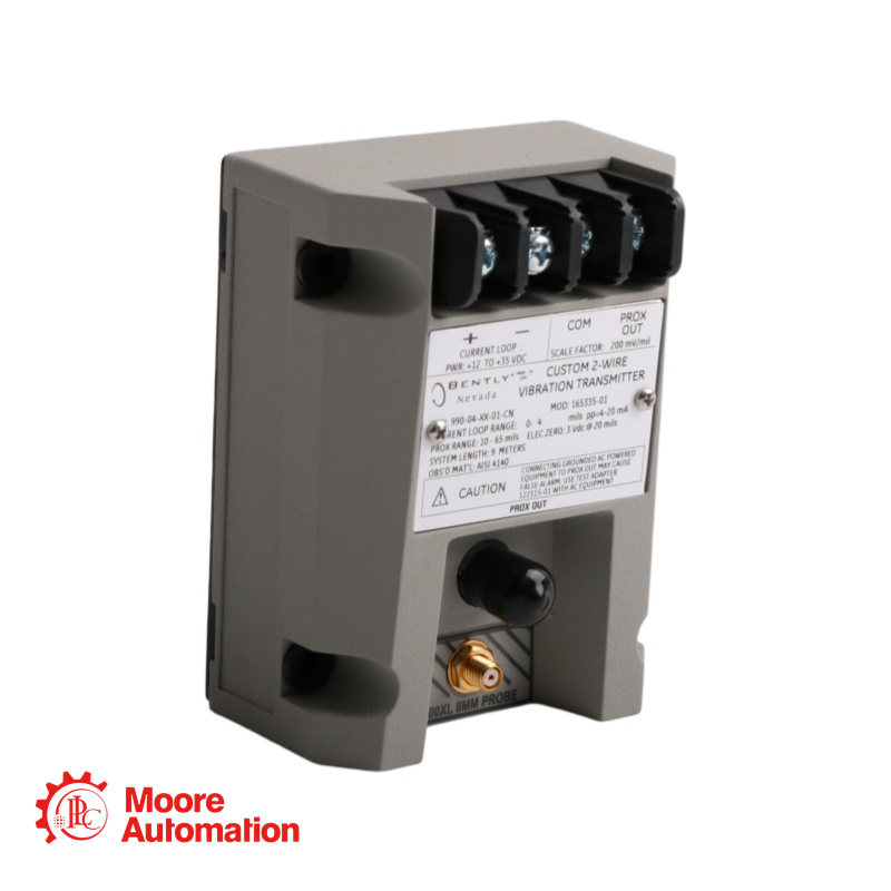 The 990-04-XX-02-05 MOD: 167577-05 transmitter is a two-wire, loop-powered device that accepts input from our 3300 NSv proximity probe and its matching extension cable (available in 5 m and 7 m system length options).